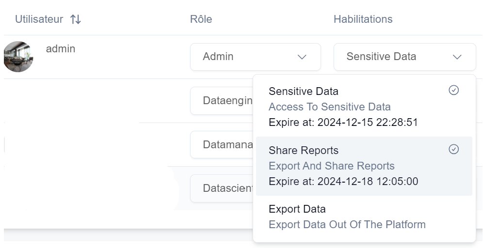 | Datascientist | The data scientist role has access to catalog, report, and data science features. | Reports only with token - Catalog - Synthetic Data - Model Evaluation |