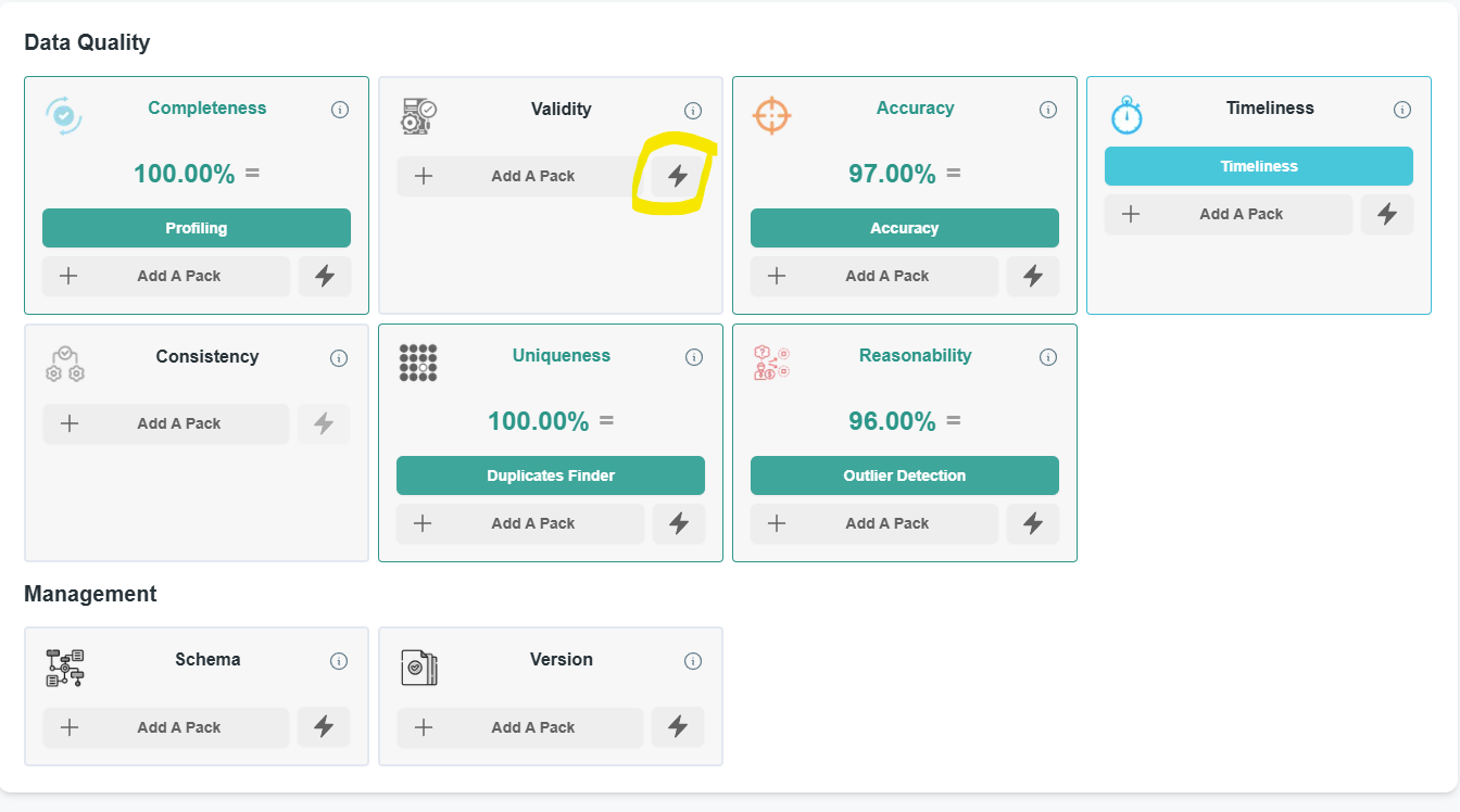 When clicking on it on a source page, it will select and create a routine using the first available Pack compatible with your source, and specific for that data quality dimension.