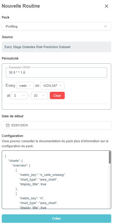 The routine creation panel allows you to select the pack to use, the frequency of routine execution, the start date of the routine. Once the pack is selected, the default configuration is loaded. You can then override the default pack configuration specifically for this routine. You can expand the pack's documentation drawer to understand better what config is most suited for your needs.