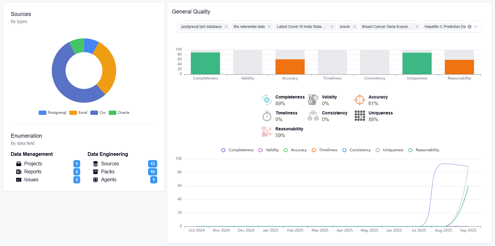 The dashboard allows you to visualize the status of your sources, user activity on the platform, as well as macro information about your data quality and data governance.