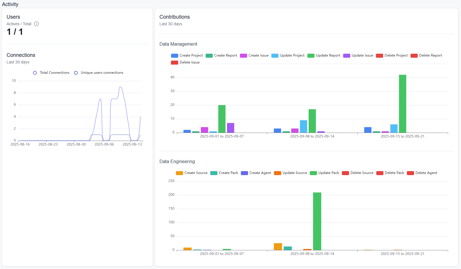 KPI metrics on user activity, Projects, issues, sources, reports, pack, workers