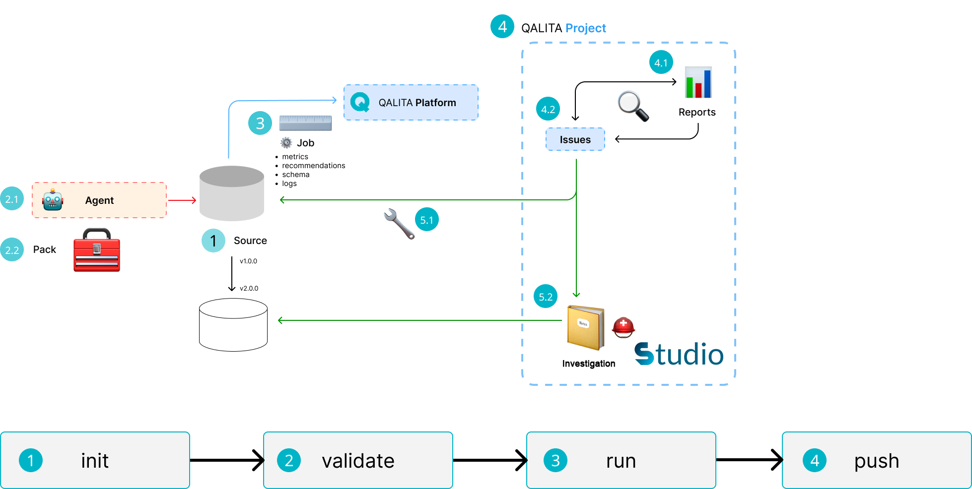 Analysis are made using a pack and an agent, producing metadata stored in QALITA Platform’s database.